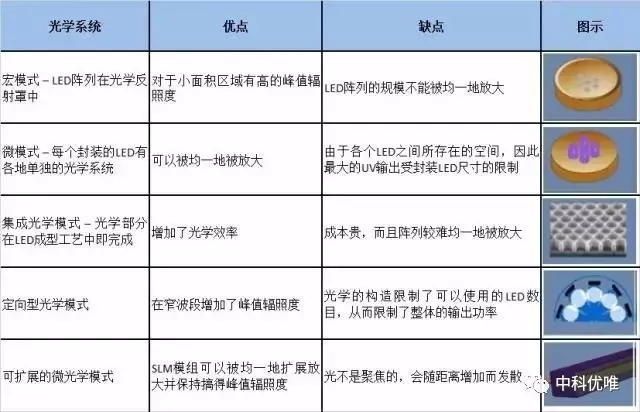 UV LED光源的效能。對于UV LED供應(yīng)商所采用的幾種典型光學(xué)方法及其優(yōu)缺點(diǎn)的匯總見下表。